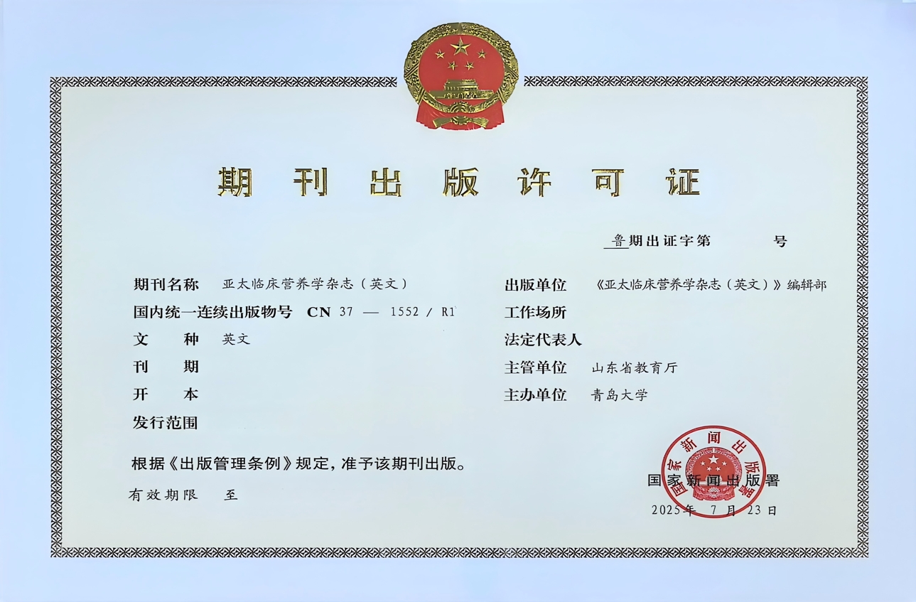 为推进亚太地域临床养分、食物平安、健康取经济的研究、教育和成长供给一个合做交换的平台。标记着《亚太临床养分学(英文)》的办刊成效获得承认,构成可持续成长的期刊焦点合作力,赋能学科专业扶植取科研立异能级提拔,APJCN) 正式获得国度旧事出书署关于开办期刊的批复。以品牌期刊夯实集群化扶植根本,英文版,是国际养分科盟的从属机构—亚太临床养分学会期刊?